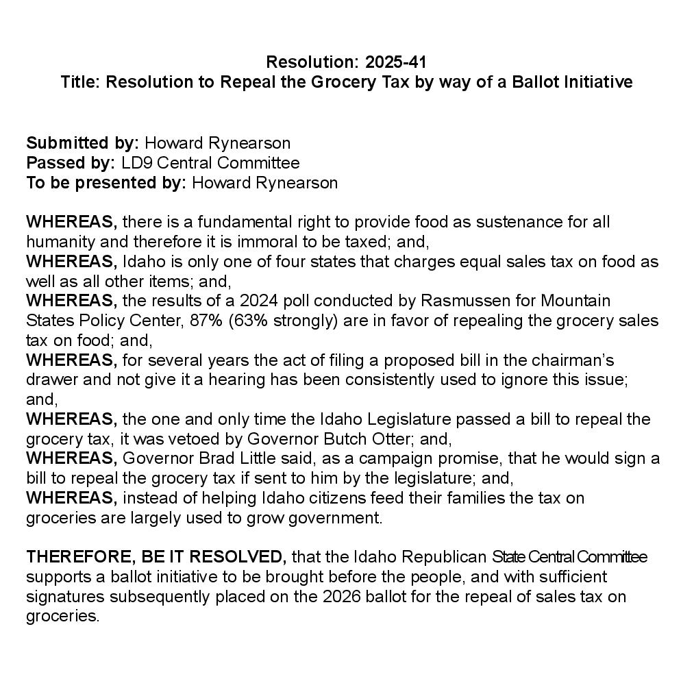 Read the PROPOSED resolution (below) calling for a ballot initiative to repeal Idaho’s grocery tax. Contact Howard Rynearson if you’d like to be involved.